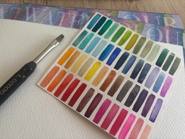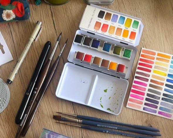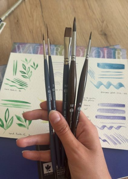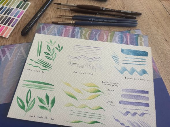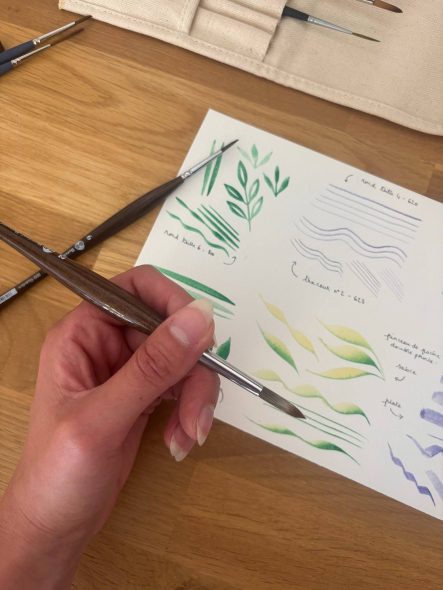 J’utilise depuis 2023, le papier 100% coton grain fin Italia de la marque Magnani 1404. Il ne me quitte plus, que ce soit pour mes réalisations personnelles ou pour mes élèves lors des ateliers aquarelle. De même pour la peinture, depuis que j’ai découvert les aquarelles Maimeri mono-pigmentaires, début 2025, j’ai agrandi la collection de couleurs et je suis 100% satisfaite de leur qualité, des couleurs vibrantes et une texture crémeuse. Je vais d’ailleurs utiliser le coffret 12 couleurs pour tester les pinceaux Borciani e Bonazzi.