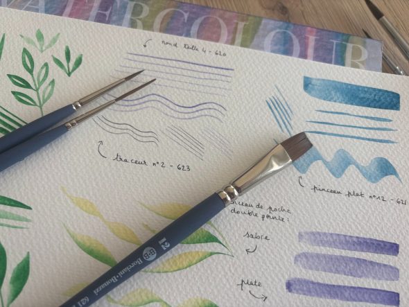 Le Géant des Beaux-Arts m’a aussi envoyé trois pinceaux imitation martre kolinsky avec un manche bleu en bois de bouleau. Le pinceau plat taille 12 série 621, le rond taille 4 série 620 et le traceur taille 2 série 621.