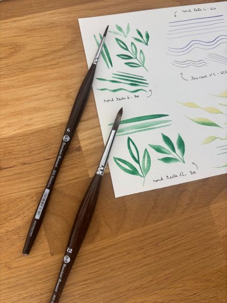 Le saviez-vous ? La taille des pinceaux n’est pas toujours équivalente d’une marque à l’autre ! Ne vous faites pas avoir et vérifiez bien la largeur de la pointe avant d’acheter et non la taille du pinceau. Depuis un an, je peins la plupart du temps avec des pinceaux ronds KUM de taille 6 et 10 (largeur 4 mm pour le n°6 et largeur 6 mm pour le n°10). Avec ces pinceaux ronds Bornaci e Bonazzi, par exemple, il faut opter pour le n°10 et le n°14 pour que ce soit équivalent !