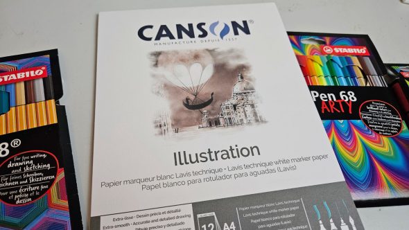 Pour réaliser ces tests, j’ai choisi le Bloc Illustration de la marque Canson. Ce papier marqueur blanc lavis technique est un papier extra-lisse pour des dessins précis et détaillés. Il comporte 12 feuilles en format A4. Il a été spécifiquement développé pour les artistes et les illustrations. Cette gamme convient à toutes les techniques de dessin. Ce papier est parfait pour le feutre, le marqueur, ainsi que la plume et le crayon. Sa surface permet des traits nets et précis, et rend le support idéal. Le grammage étant de 200g, il est suffisamment épais pour éviter le gondolement avec un peu d’eau.