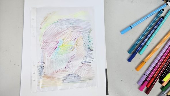 Je commence par prendre une pochette plastique de format A5, et je viens colorier avec toutes mes couleurs, j’essaie d’utiliser toutes les couleurs de la gamme. J’y vais vraiment au hasard, je n’ai pas de motif particulier.
