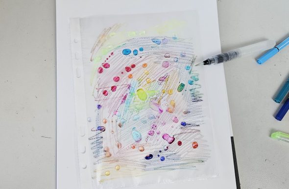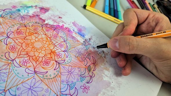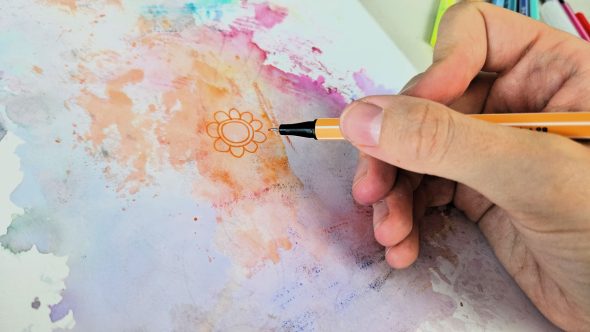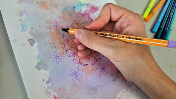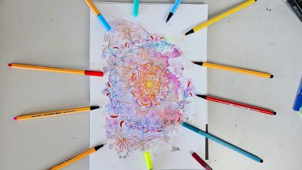 J’attends que l’encre sèche, et je vais venir prendre un par un mes Stabilo plus fins pour réaliser un Mandala sur la tâche. Le Mandala ne dépassera pas des bordures de la tâche pour donner un effet éclaboussures. Je vais réaliser des motifs fleuris.