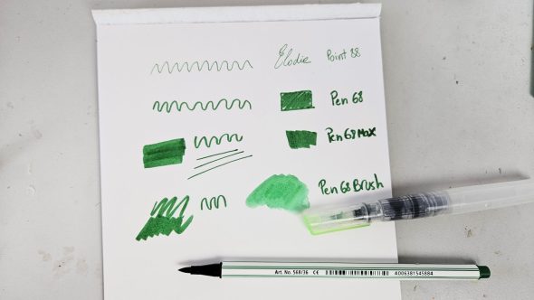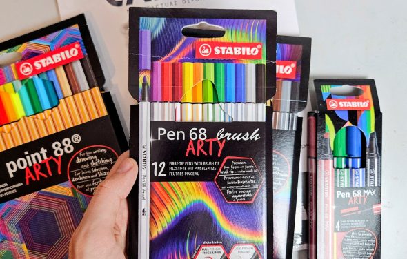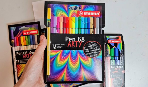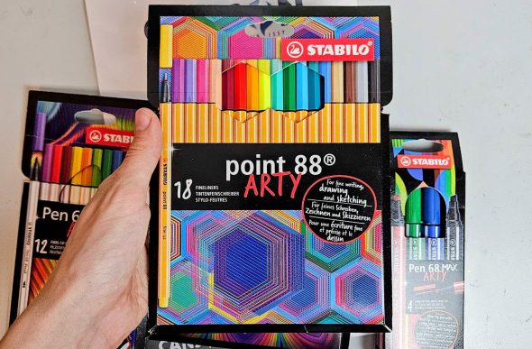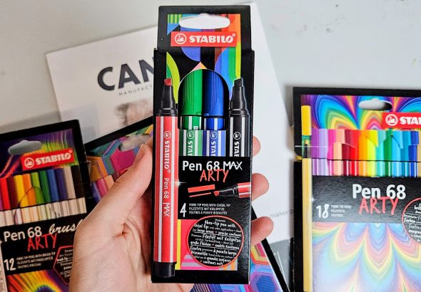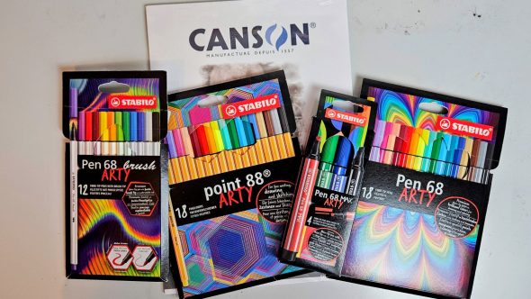 La gamme Arty de la marque Stabilo est destinée à tous les artistes et créatifs. Elle propose une grande variété de produits avec différentes pointes et effets artistiques. J’ai pu tester les Stabilo Point 88, les Pen 68, les Pen 68 max et les Pen 68 Brush. Dans la gamme, il existe aussi d’autres produits que je n’ai pas encore testés : les fameux surligneurs Boss, les crayons Green Colors, les crayons aquarellables Aquacolor, les crayons Woody 3 en 1, ainsi que plusieurs sets et trousses. Tous les feutres Stabilo sont à base d’eau de couleur, dépourvue de conservateurs et solvants et donc inodore.